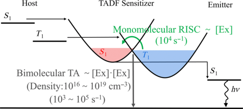 通过磁致电阻 (magneto-resistance)、磁致发光 (magneto-photoluminescence, magneto-electroluminescence)、磁致光电导(magneto-photoconductivity) 等手段来研究涉及自旋转换的激发态过程,例如热致延迟荧光 (TADF),单线态裂分 (singlet fission),三线态湮灭上转换 (TTA upconversion)。以满足激发态过程角动量守恒为出发点,瞄准单线态-三线态等自旋构型转换途径,进一步设计材料体系优化器件整体性能。