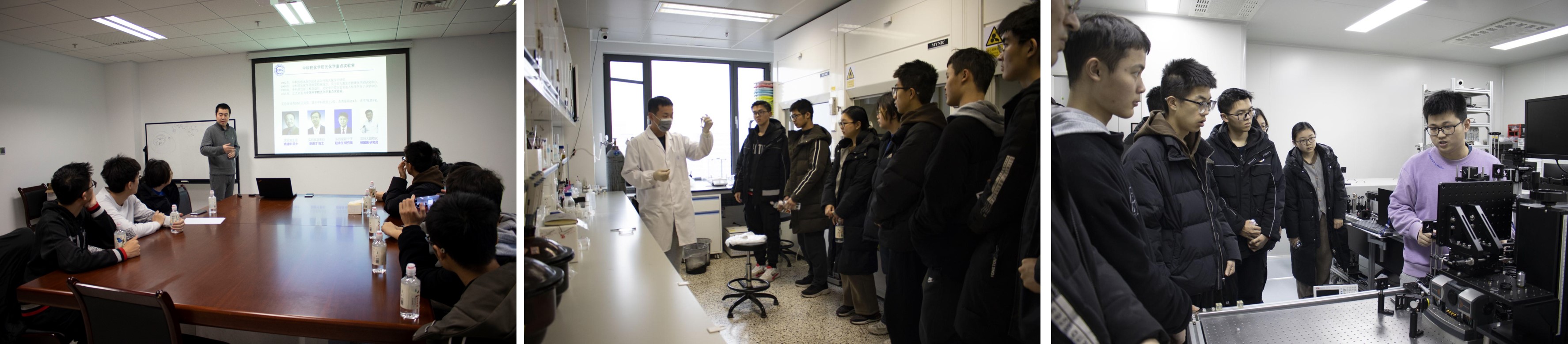 从左至右:张闯研究员介绍光化学实验室;贾浩博士研究生展示相关实验;陈锐博士研究生介绍相关仪器
